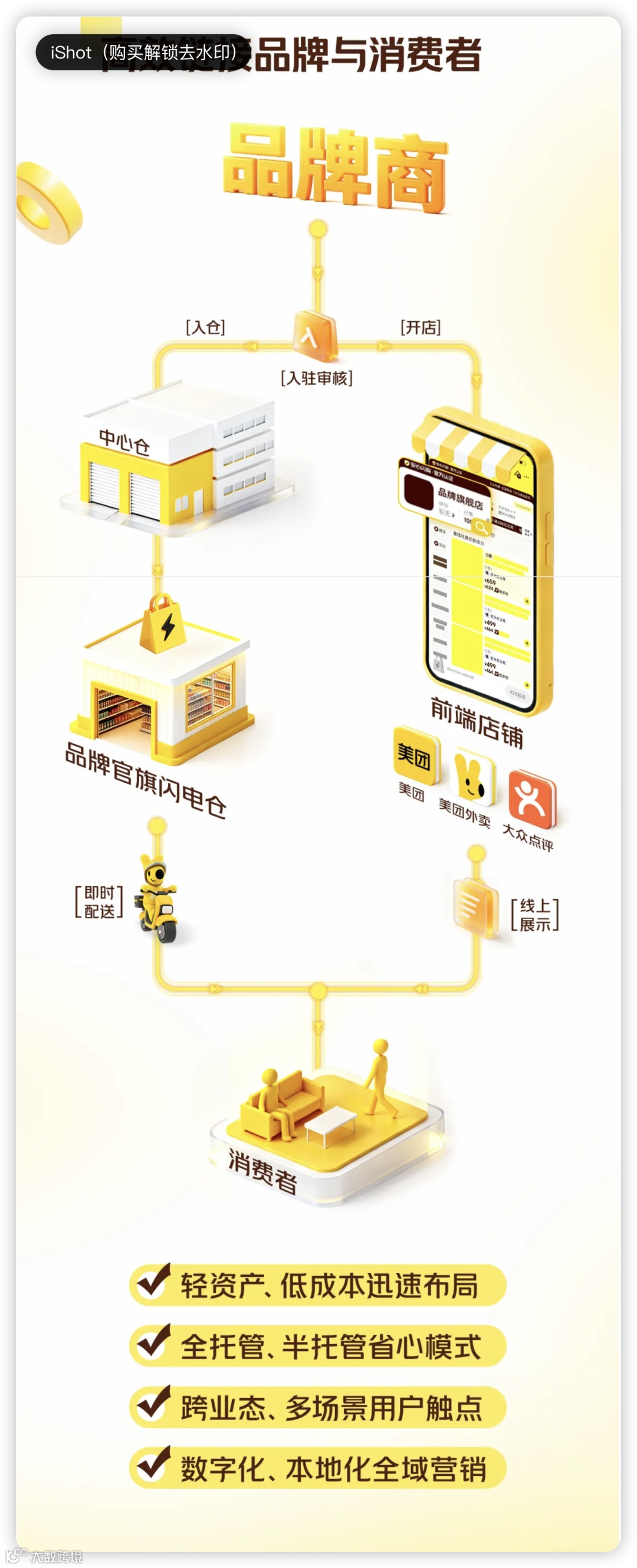 因为省去了这些麻烦,品牌商只要资金足够,就可以快速在全国各地有品牌官旗闪电仓的地方铺下去,消费者在美团上下单,骑手30分钟送上门。