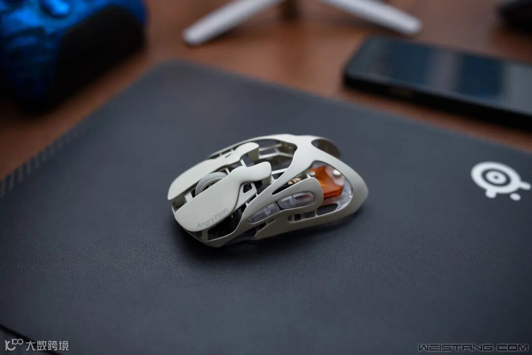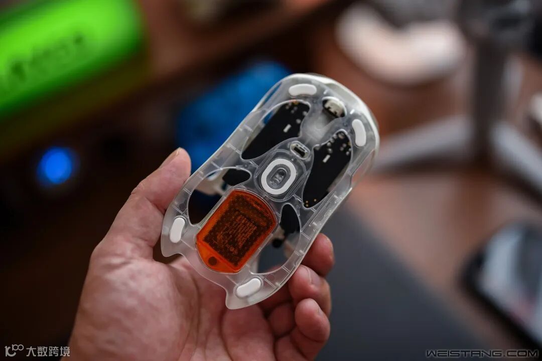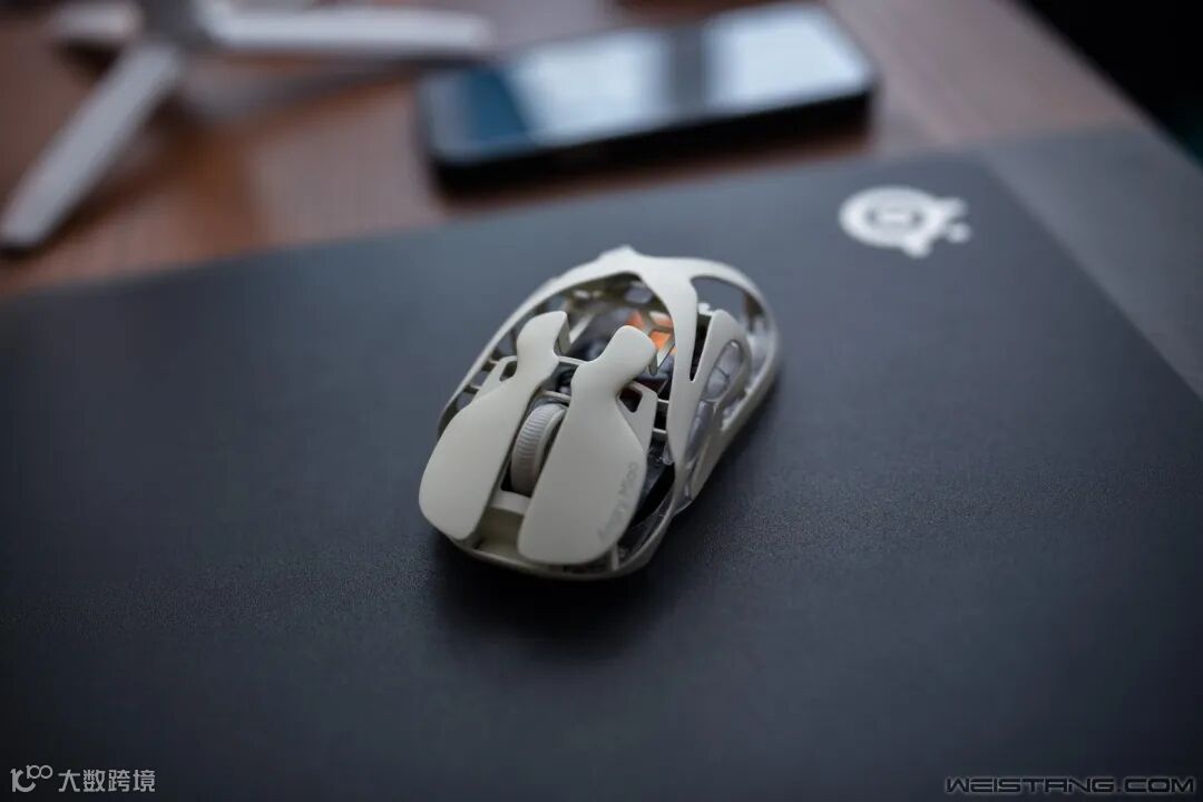 云白配色UV涂层质感很细腻,颜色稍微偏暖,滚轮也换成了白色,侧键和底壳换成了白透配色,PCB和电池模块没有变化。两片按键和一体式外壳都是铝镁合金材质,无线模式下整体重量来到了49g。这个镂空设计还是兼顾了对手掌与手指的支撑,镂空外形元素设计清晰。按键触预压行程极短,习惯罗技GPW的小伙伴上手应该很容易。