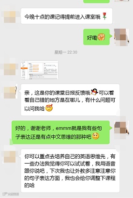 每次上完课后助教老师就会及时反馈我的课堂情况,还把我的学习日报直接展示给我看,并且说出让我注意的点,以及询问我对下一节课的需求,并且需不需要调整课程,我感觉必克英语的课后服务也是蛮好的。后来在这家学了之后口语变流利了很多。