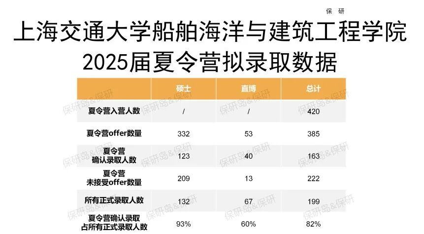 从上海交通大学船舶海洋与建筑工程学院2025届夏令营拟录取数据来看,其共计入营420人,入营人数较多,其中385人获得offer(优营率约为92%),优营率极高,而最终正式录取的仅有199人,存在超发offer的情况。