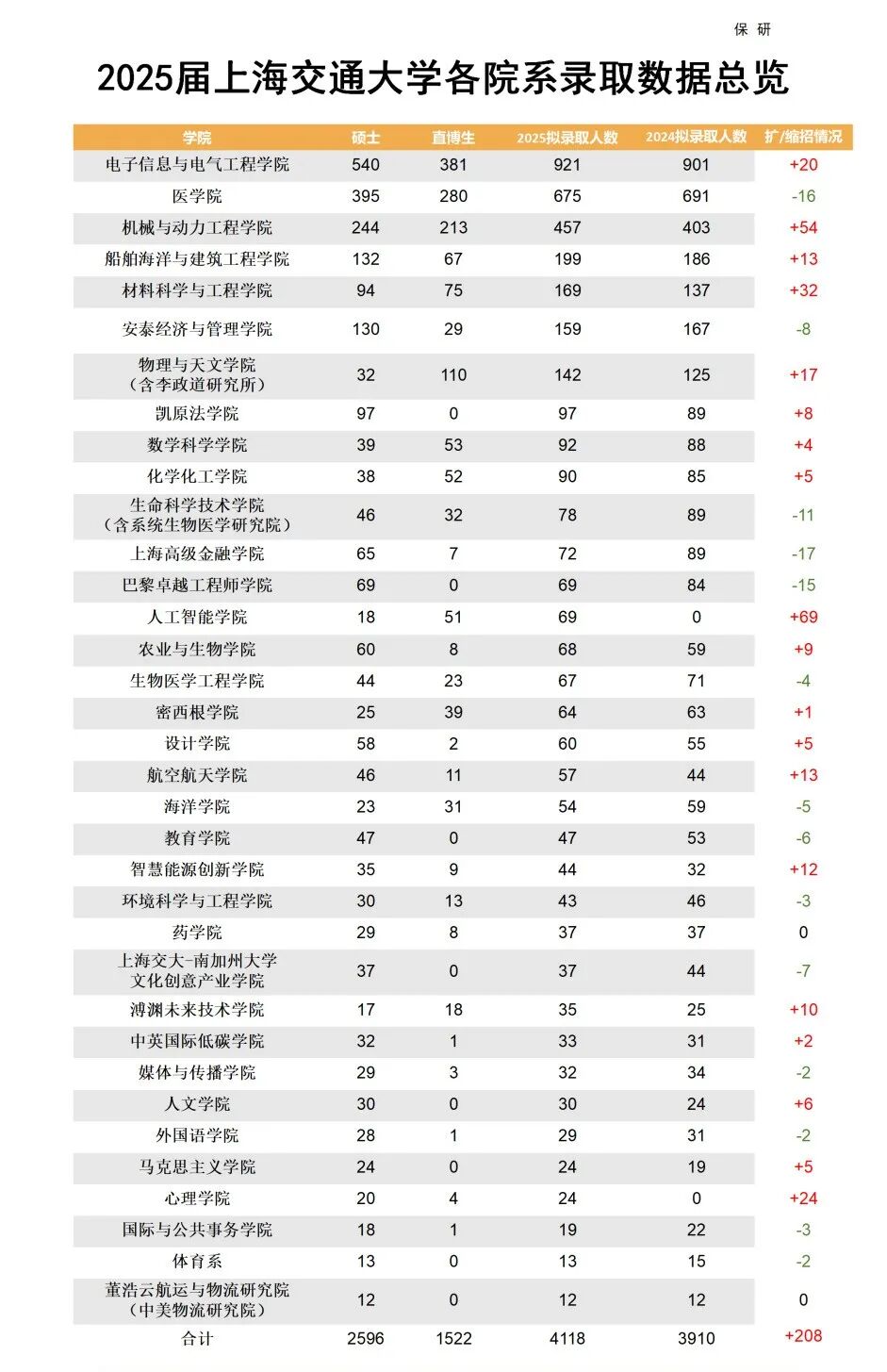 总体而言,上海交通大学2025届推免生招生呈现扩招趋势,共计增加307个接收名额。具体到各院系的招生规模上,大部分院系均有扩招。