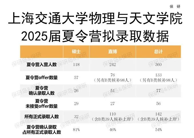 从上海交通大学物理与天文学院2025届夏令营拟录取数据来看,其共计入营360人,入营人数较多,其中133人获得offer(优营率约为37%),优营率不高,其中物理学直博有候补(B类营员)98人。学院最终正式录取的有142人,虽推免生总数大于夏令营优营数,但天文学直博生存在超发offer现象,天文硕士优营率仅为5%。
