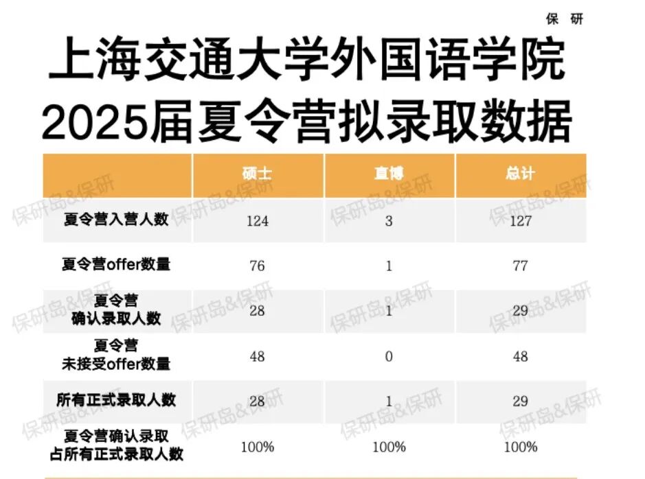 从上海交通大学外国语学院2025届夏令营拟录取数据来看,其共计入营127人,入营人数较多,其中77人获得offer(优营率约为61%),而最终正式录取的仅有29人,存在超发offer的情况。该院的优营政策亦为择优录取,额满即止。
