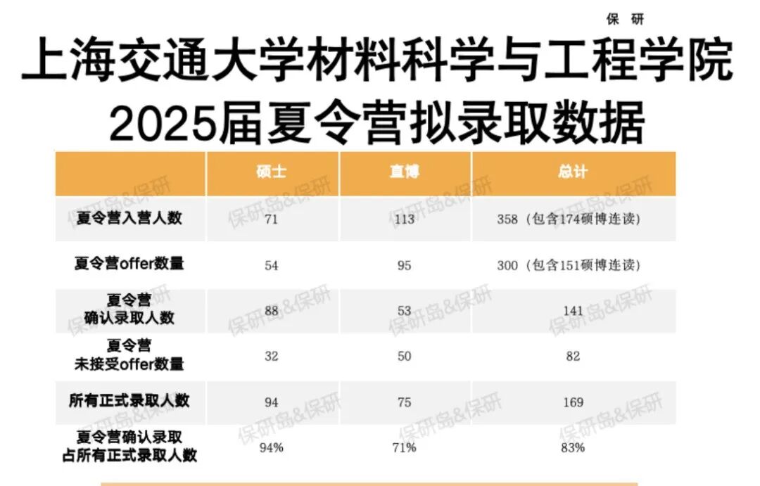从上海交通大学材料科学与工程学院2025届夏令营拟录取数据来看,其共计入营358人,其中300人获得offer(优营率约为84%),优营率极高,而最终正式录取的仅有169人,存在超发offer的情况。