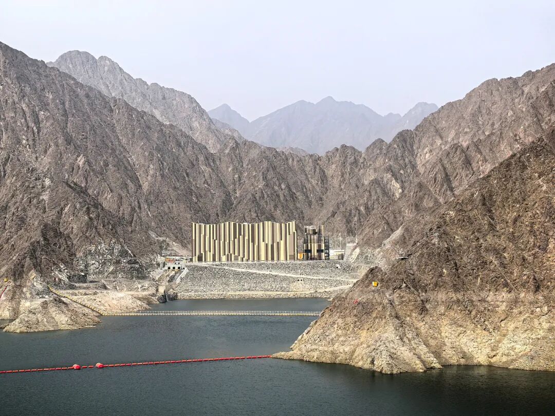 漂亮“公主”背后的功勋之一是哈塔水坝,该水坝的四周是哈吉尔山脉的崎岖山峰。此地的停车场离水坝有一段距离,我不想在烈日下暴晒,于是把车开了上去,上面也是一个人都没有。这座大坝建于1989年,为控制来自山区的水流而建,建成后可以为哈塔地区提供饮用水和电力。我把车停到大坝边,走下车欣赏这里的山水风光,觉得哈塔一行非常值得。