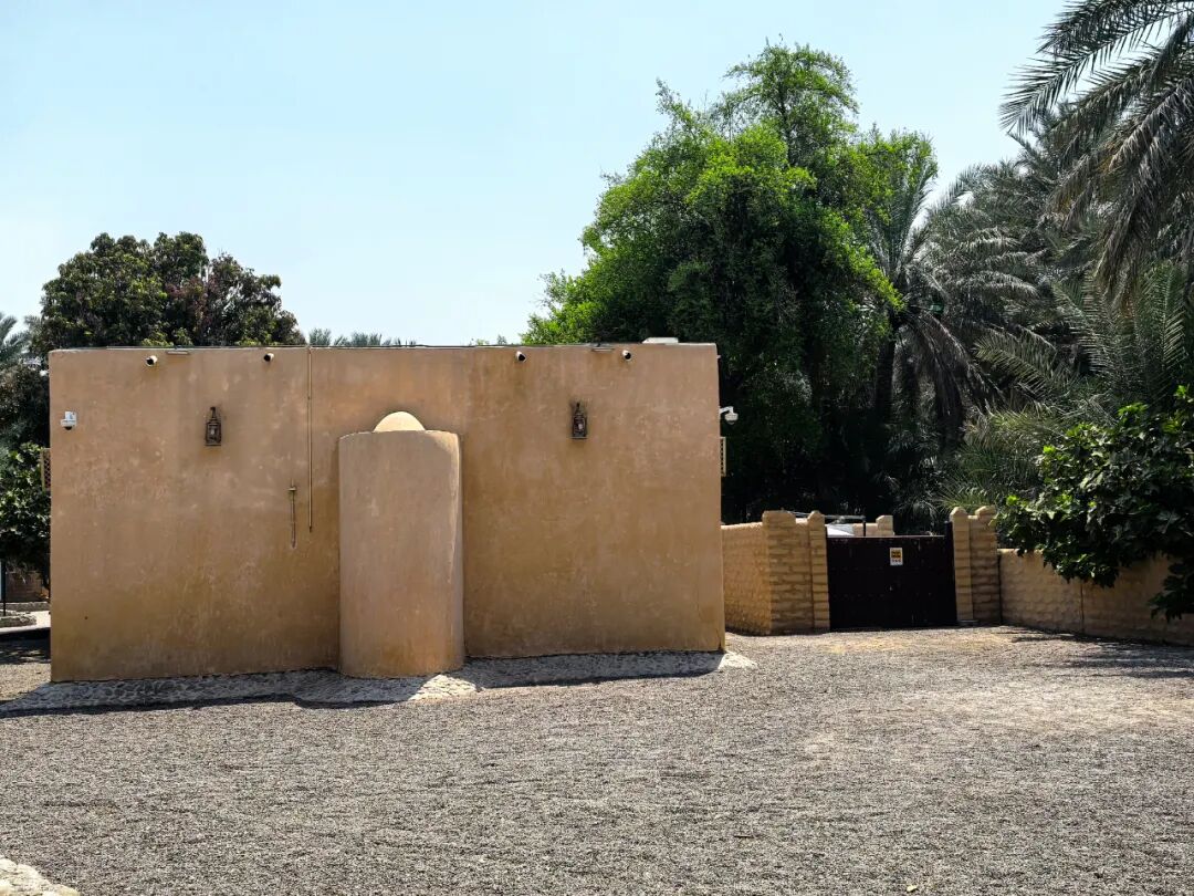 司机在一个椰枣树旁停下,让我从树上摘椰枣吃,我拒绝了。我可不敢乱吃,像在印度一样吃坏肚子我就完蛋了。最后司机在另一处停下,让我下车走进绿洲内参观,路旁是关于法拉吉灌溉系统的介绍,其旁是一座小型清真寺。我走进树林中,里面的水道纵横交错,有的水道里流着清澈的水,这些水滋养着阿莱茵四周500多个农场。如果不是热得要人命,我一定会在绿洲里徜徉,久久不会离去。