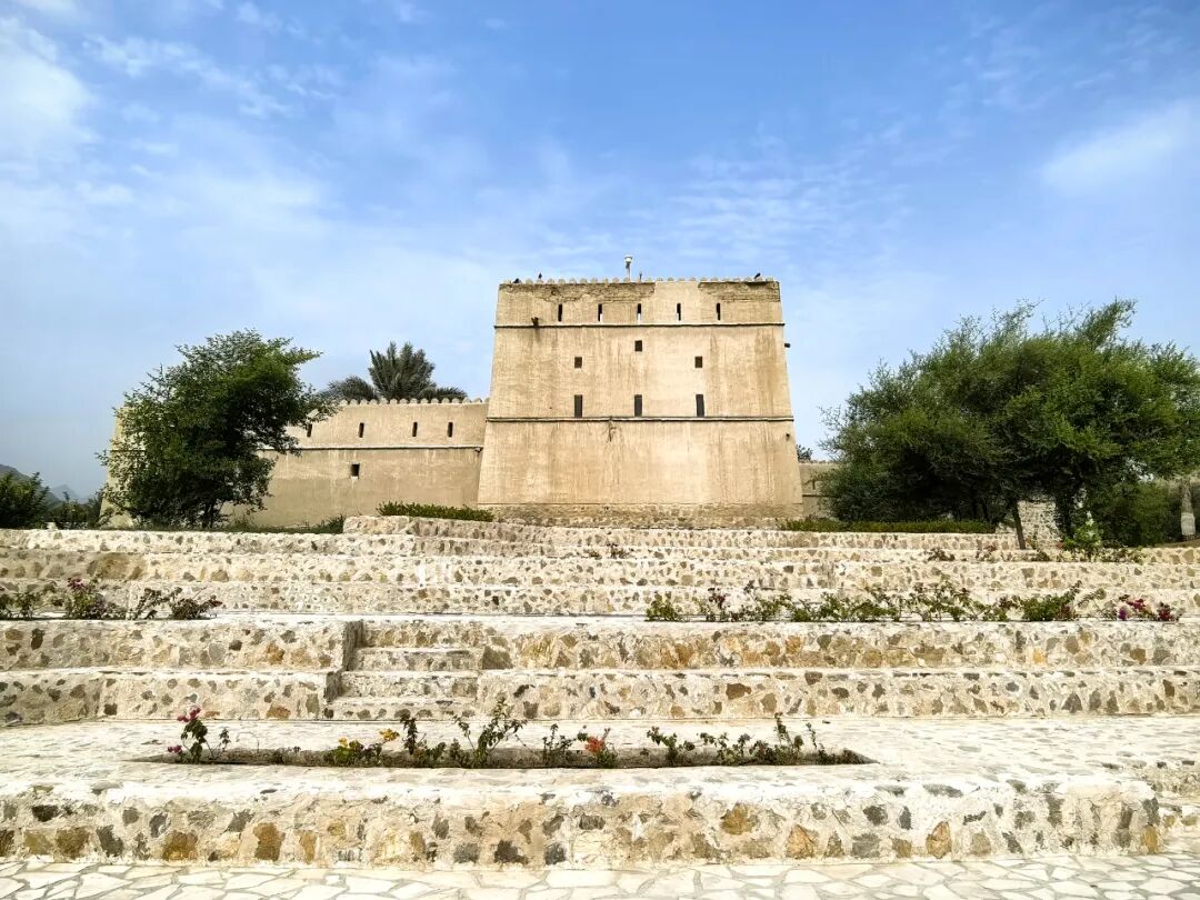 到达这里时,上午10点刚过,但温度已经飙升到40摄氏度。城堡前没有停车场,我得停到离城堡100米之外的地方。在如此高温下走100米,我觉得我要被烤成干了,幸好我不用买城堡的门票。该城堡呈正方形,长不到120米,高8米,顶部有炮眼和三角形阳台,还有三座圆形瞭望塔和一座矩形瞭望塔,里面正中是空旷的广场,广场上摆着古代阿联酋人的生活器皿。我在无人的广场上走了一会,热得就要背过气去了,看见旁边有一个门,推开一看,里面是带空调的礼品店和咖啡馆。我吹着冷风,不想迈出大门一步。