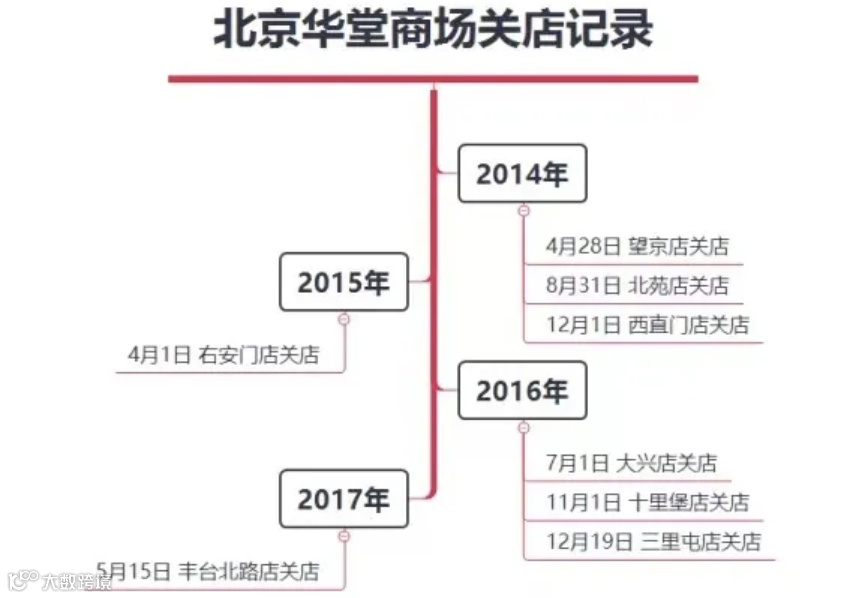 自2014年起,北京华堂开启关店潮,五棵松、望京、北苑、丰台北路等门店相继关闭,至2017年仅剩亚运村店维持运营。