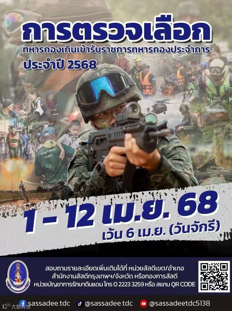泰国皇家陆军宣布,2025年度征兵(เกณฑ์ทหาร 2568)将于4月1日至12日进行,4月6日除外[k]。所有符合条件的男性须按指定时间与地点报到接受兵役检验,否则将承担法律责任[k]。