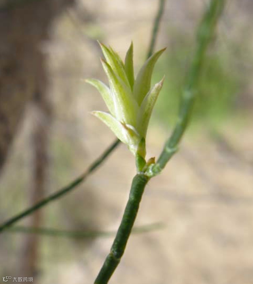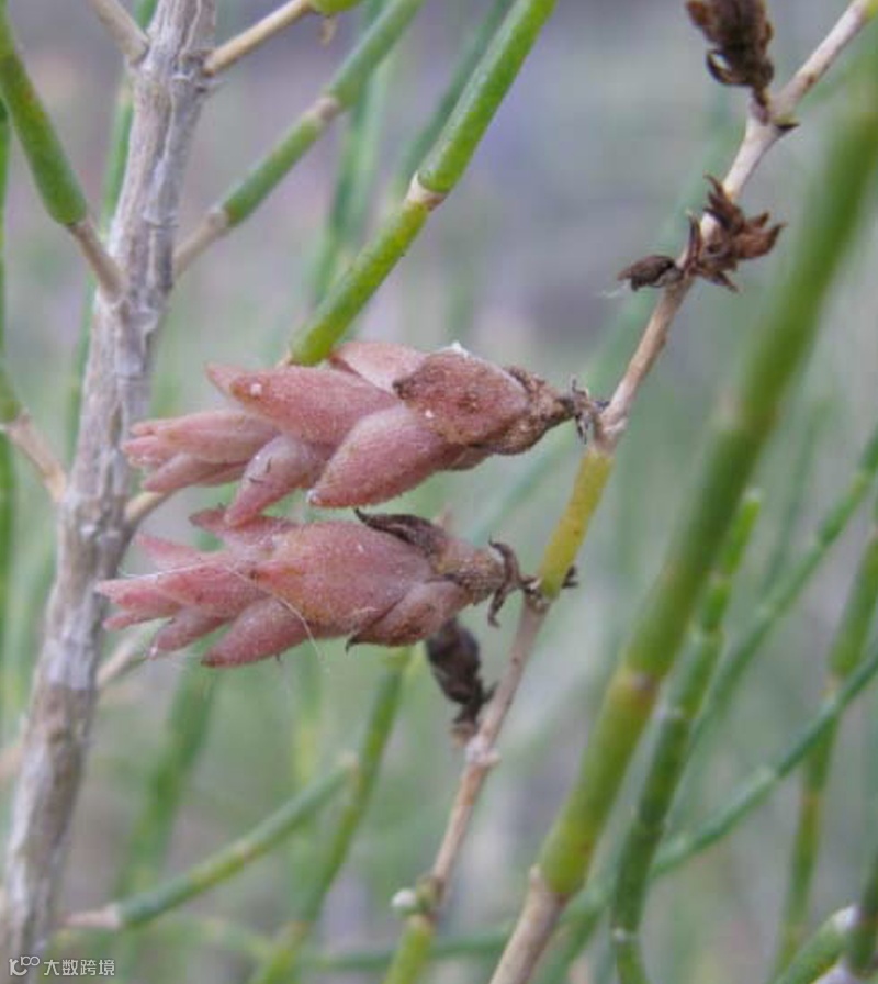 胖木虱在梭梭和白梭梭上危害形成的叶苞状虫瘿,是由一片片苞片组成。
