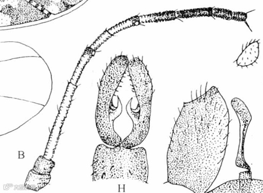 A.头、前胸顶视;B头前视;C.触角;D.前翅;E.后翅;H.后足