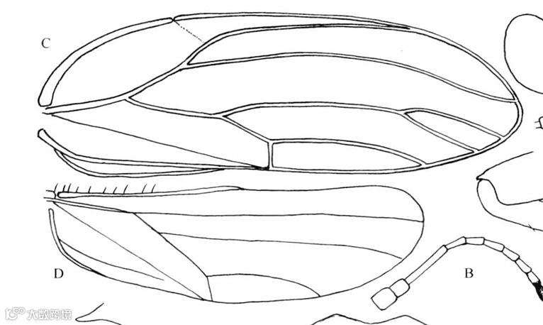 A.头;B.触角;C前翅;D.后翅