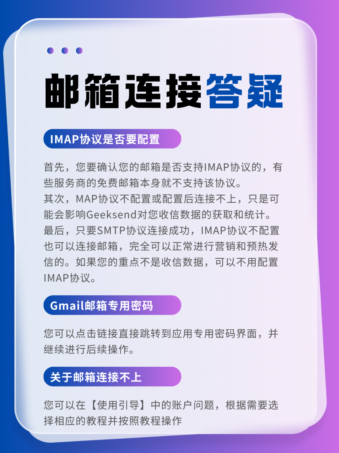 在第一期的Geeksend产品问题答疑中,我们就教程查找、邮箱验证、邮箱查找三个方面,给大家做了详尽的解答。