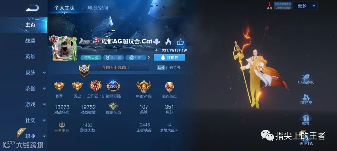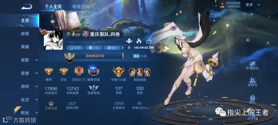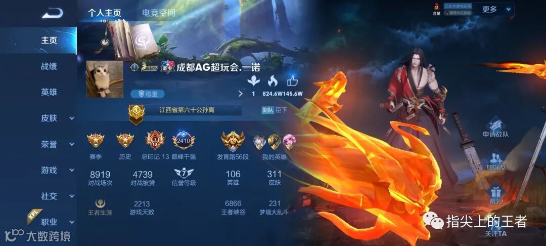 好奇看了下他的主页,这个赛季主要用不知火舞上分,现在是国一,去了辅助位那么久,看来本职业的英雄还是操作得来啊。