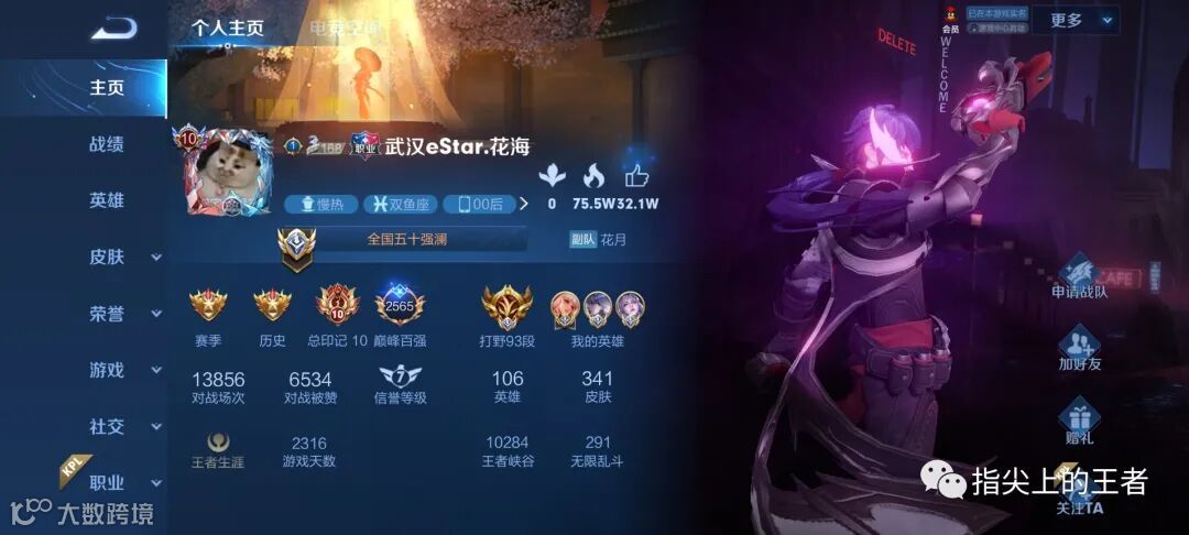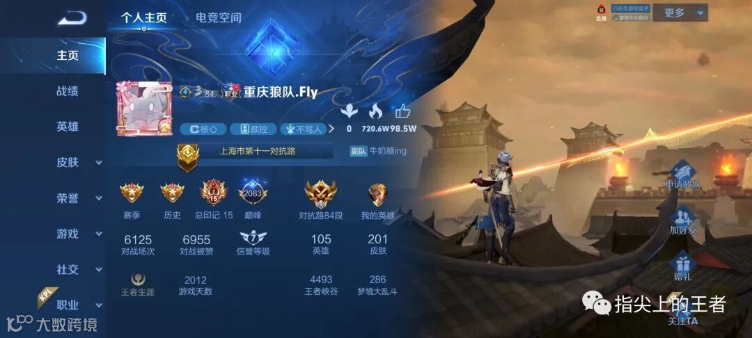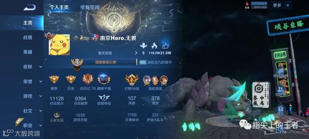 无畏是打野,裴擒虎是他比较擅长的英雄,所以主页中放的是天狼狩猎者,其实要我说,这款皮肤出场动画也好,建模也好,都不及海报帅,这个皮肤的海报我用了好几个赛季。