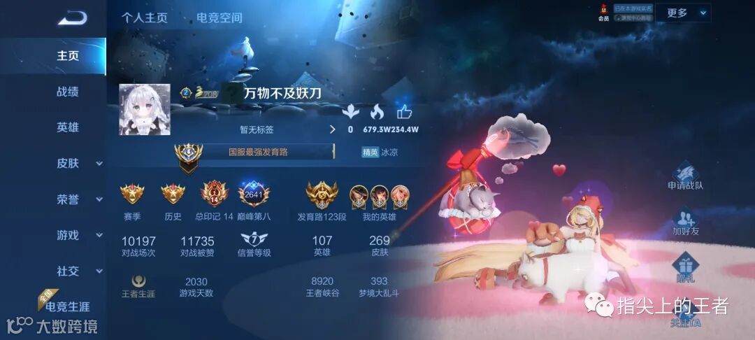 妖刀的个人主页放的是大乔的猫狗日记,没想到一个野王射爹,竟然放了一个辅助的皮肤,还是软萌家居款的,的确有点意外。
