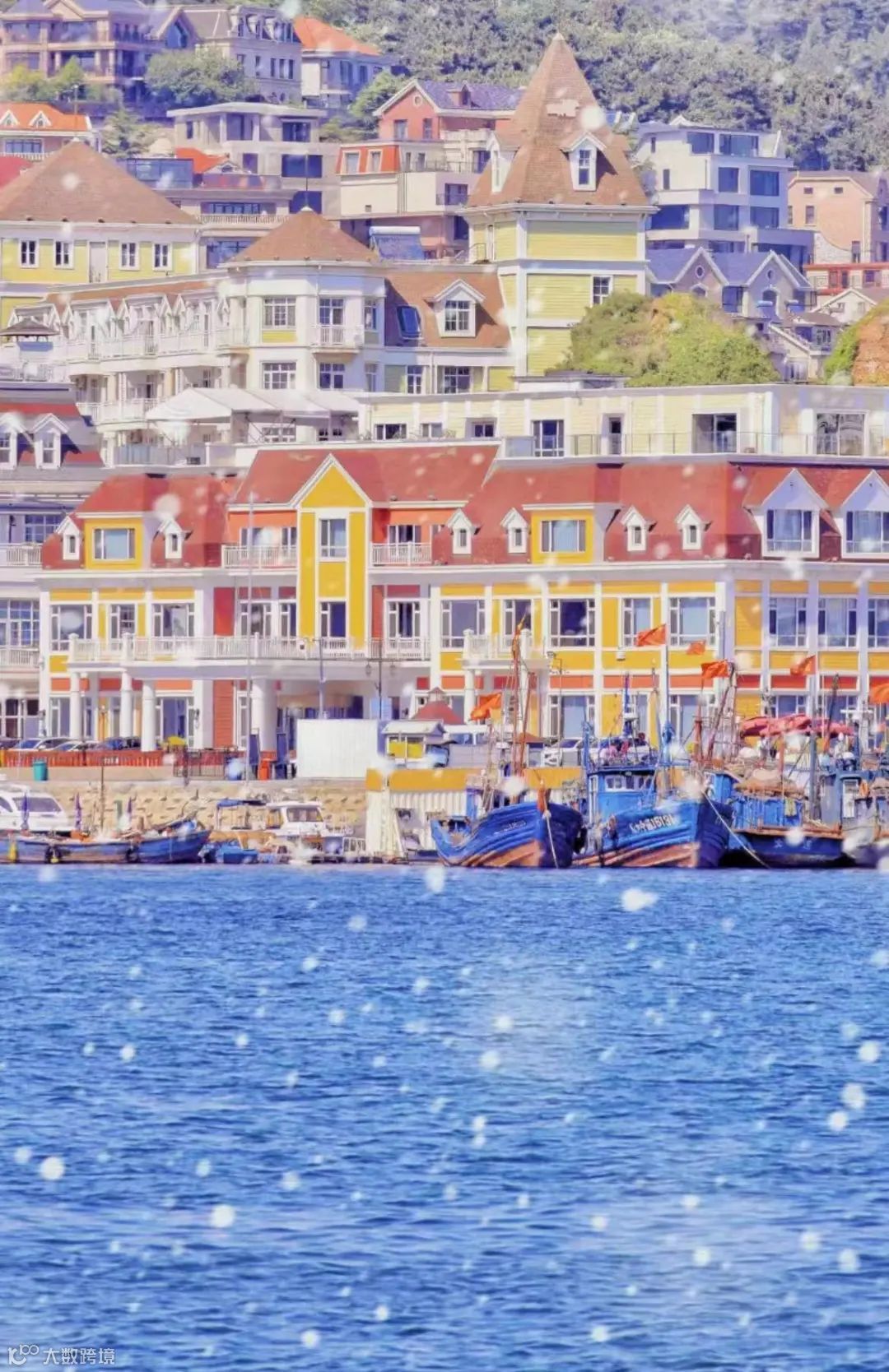 菱角湾也是冬日玩大连的必打卡之地,以雪为底色,背景是渔人码头的一排欧式建筑。