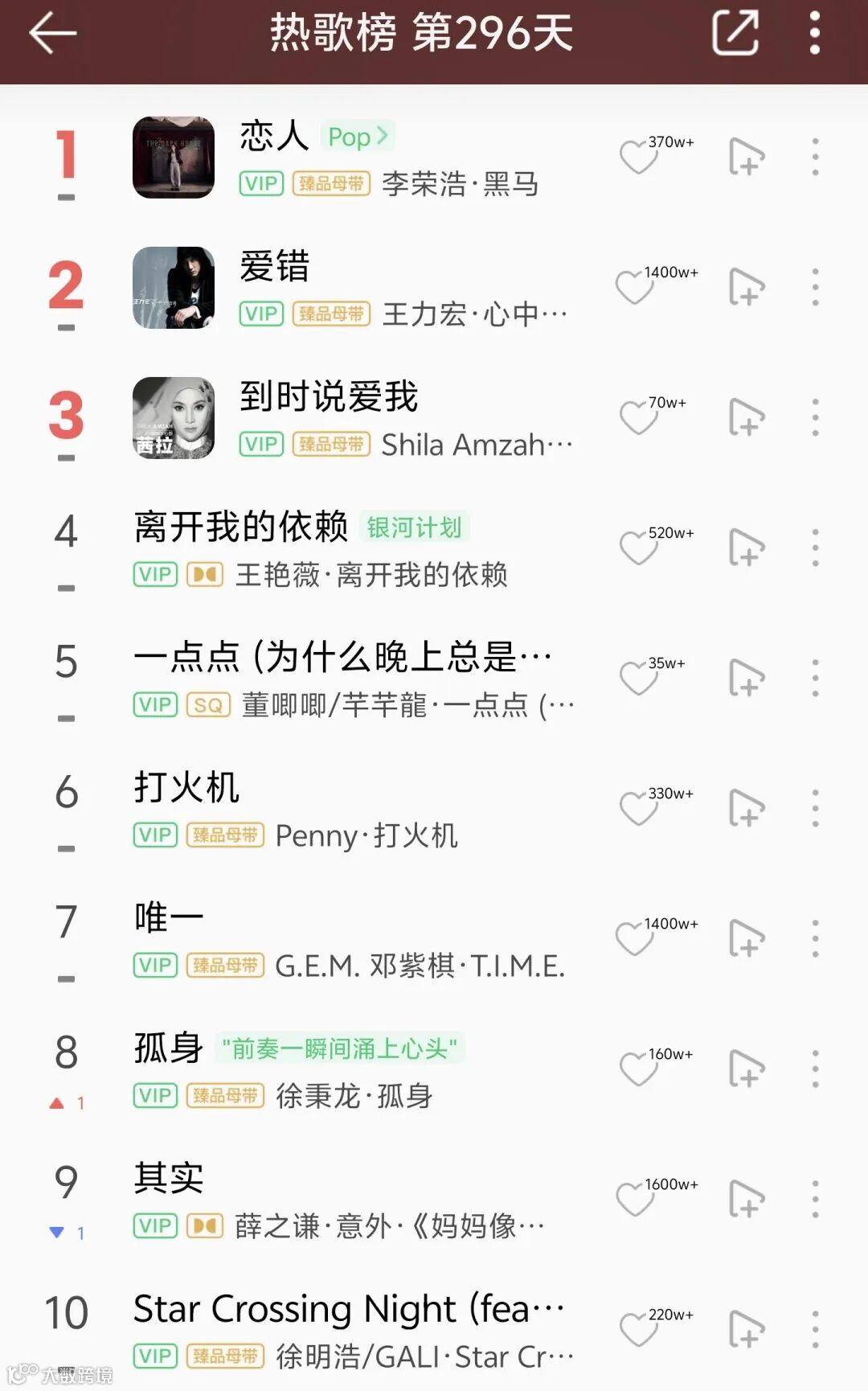 2、10年前的老歌2首上榜。