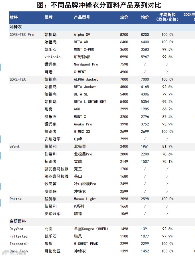 eVent面料主要有部分国产品牌应用于中高端定位的产品系列,如伯希和的北极星、拓路者的雪鹰、喜马拉雅的壳王和苍山、牧高笛的冷山极境,定价普遍在2000元左右,伯希和电商折扣在8折左右,拓路者在7折左右,两品牌在2024年均有接近8000件的销量。