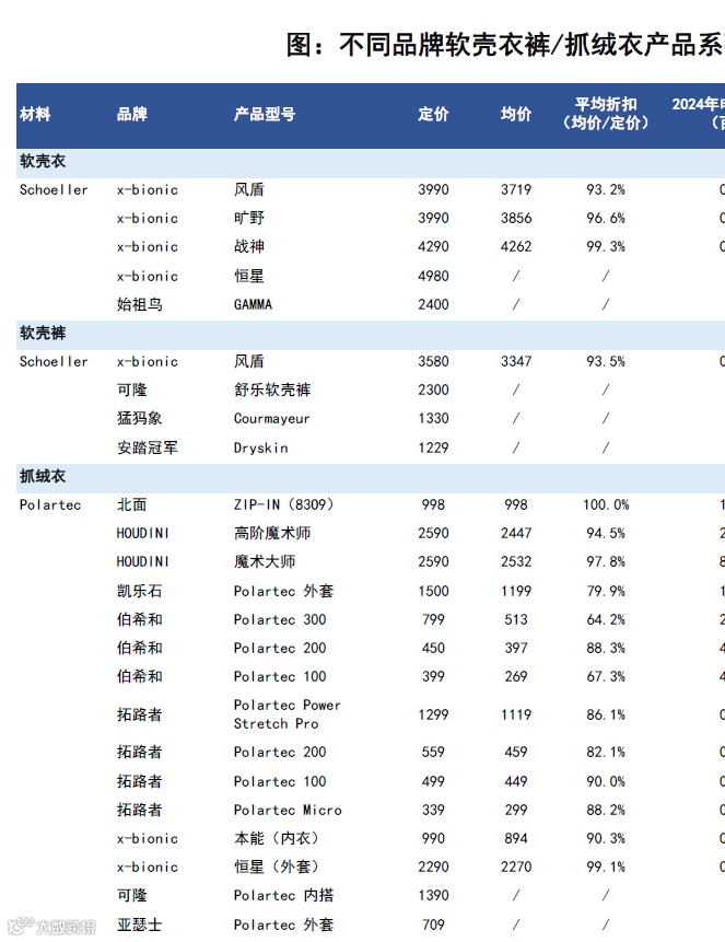 Polartec面料在抓绒衣上的应用较为普遍,根据不同品牌定位、以及产品形态(外套/内搭)、厚度(300/200/100),定价差异相对较大。2000+的品牌主要有HOUDINI、x-bionic;1000+的品牌有可隆、凯乐石、拓路者Polartec PowerStretch Pro系列;伯希和、拓路者大部分Polartec产品均价在500以内。从销量来看,2024年伯希和及HOUDINI销量最高,相关系列合计均超过10万的销量。
