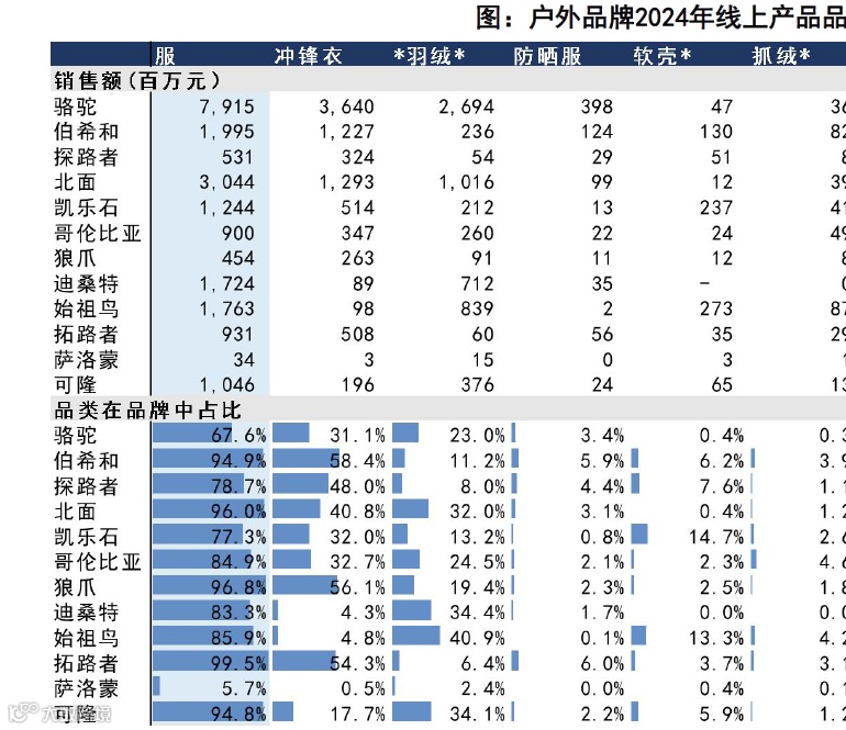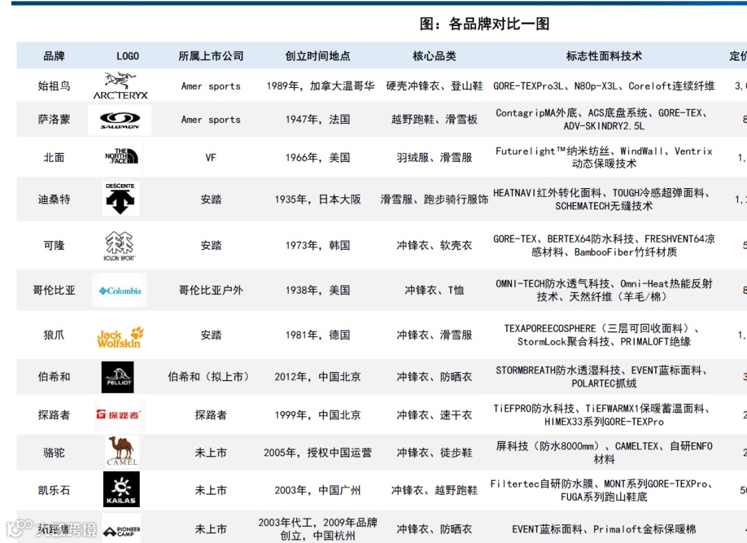 轻户外大众休闲 :其余品牌中,迪桑特、可隆、哥伦比亚、伯希和、探路者、拓路者、骆驼,更适合轻户外,以及日常休闲通勤场景。