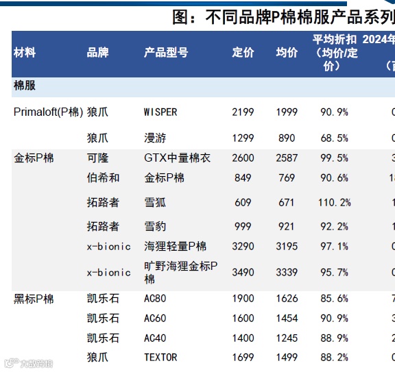 据不同品牌定位、p棉规格(金标/银标/黑标)、填充量(40/60/80g/m²),定价差异相对较大。x-bionic、可隆的金标P棉系列产品定价在3000元左右;凯乐石、狼爪的黑标P棉系列定价在1500-2000元左右;伯希和、拓路者定价在千元以内。销量来看,伯希和居首位、凯乐石其次。