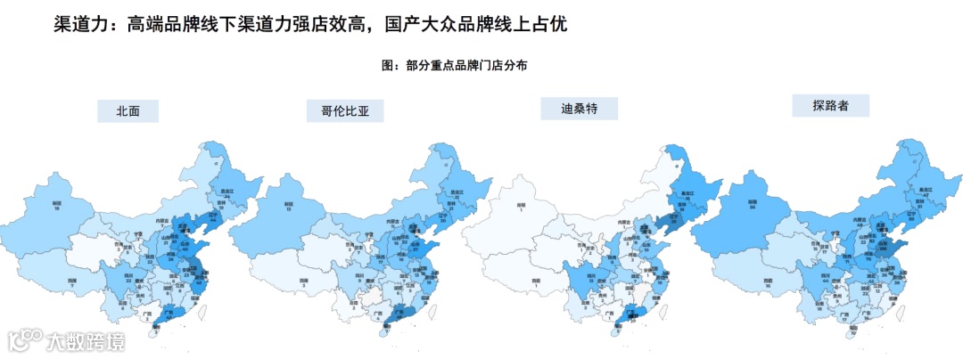 • 渠道特点:高端品牌 (始祖鸟、迪桑特、可隆)门店主要位于高线城市核心高端商场,面积较大;中高端品牌(北面、凯乐石、哥伦比亚)目前点位较多,城市覆盖率高,亦存在低线城市门店;国产性价比品牌伯希和、探路者有更高的下沉市场渗透率,均在30%以上,主要通过加盟门店覆盖下沉市场。