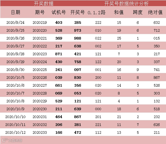 | 绝对值:当期每一位开奖号与上期每一位开奖号的差值绝对值 |