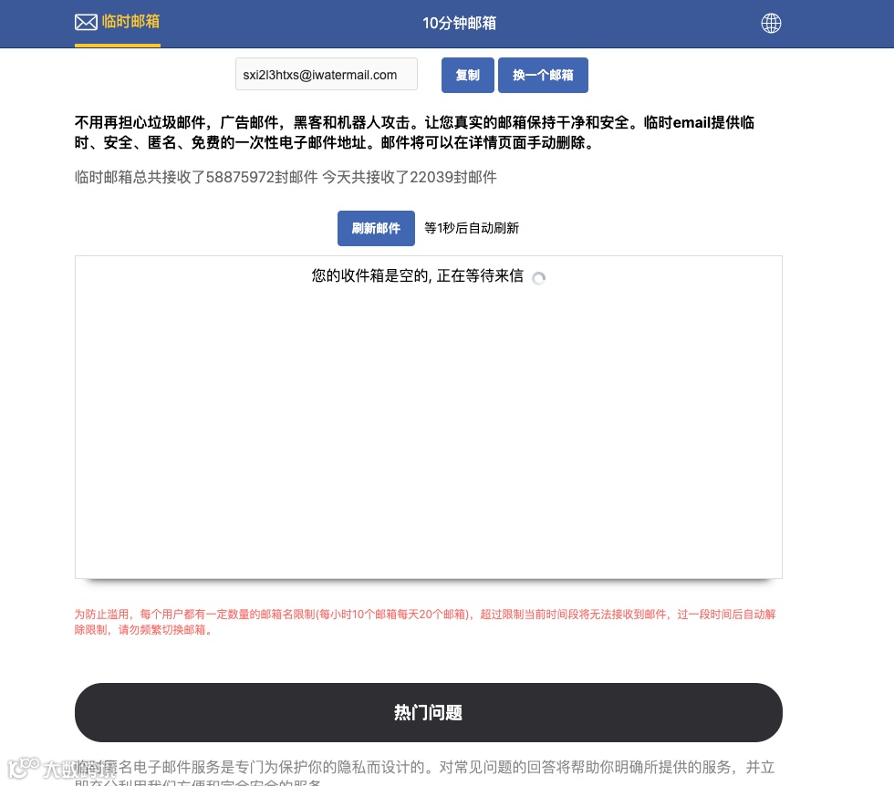 为防止滥用,每个用户都有一定数量的邮箱名限制(每小时10个邮箱每天20个邮箱),超过限制当前时间段将无法接收到邮件,过一段时间后自动解除限制,请勿频繁切换邮箱。
