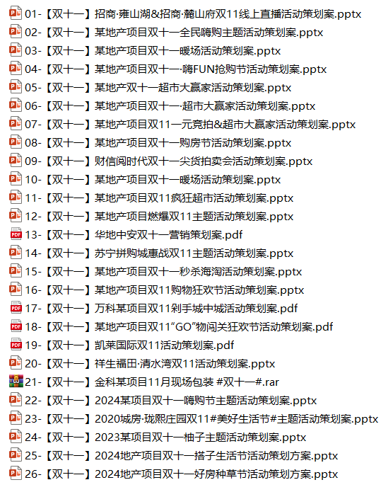 在11月份,最重要的销售节点就是双11大促啦。为此,我们还整理了26份双11促销活动方案,其中包括: