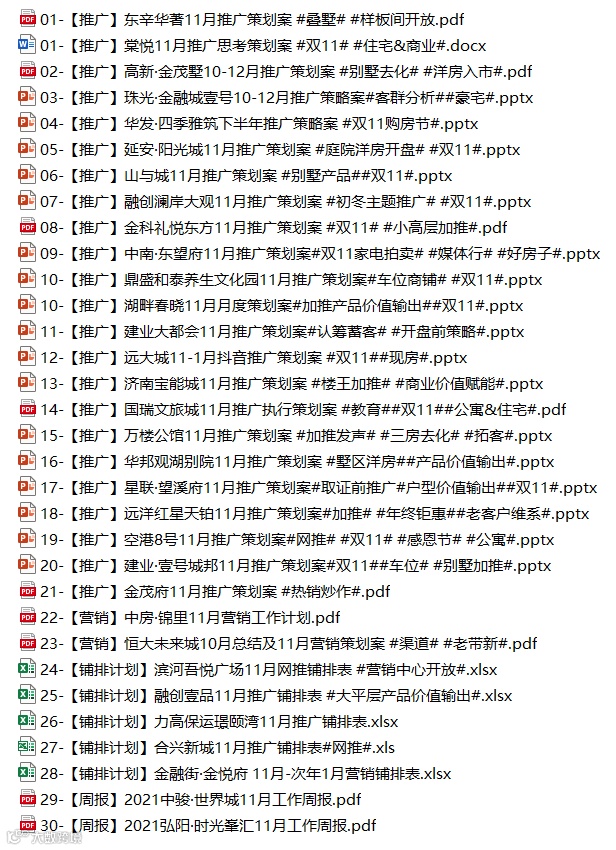 在我们这份《地产11月月度方案合集》里面,从别墅、洋房、高层、车位到商铺,从新品入市、开盘到加推,从推广方案、网推方案、营销方案、铺排计划到项目周报,都有所相应的参考方案,资料非常全面,具体包括的方案清单如下: