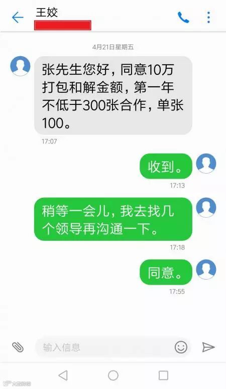 短信方式确认后,我代表客户与视觉中国就和解协议的具体条款进行协商。