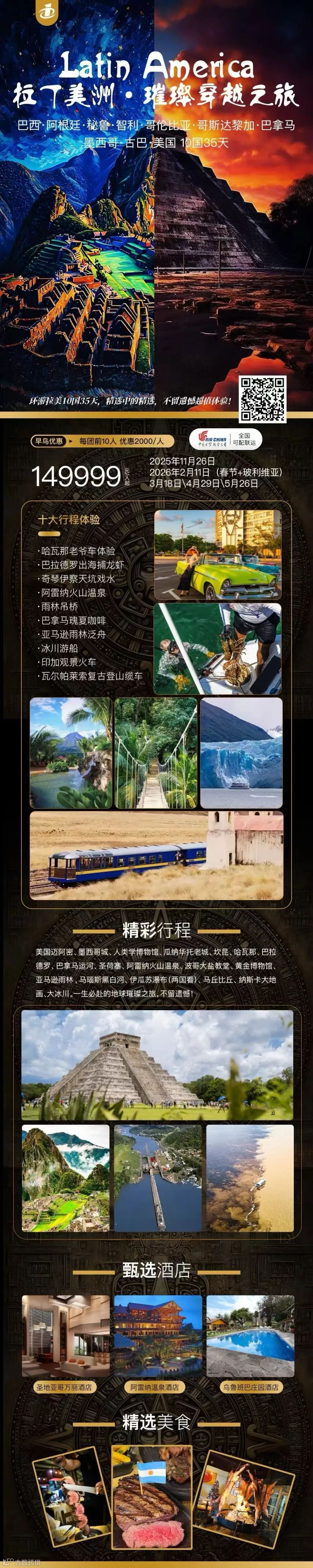 这趟行程既有历史控爱的文明遗址,也有自然迷狂追的瀑布冰川,还有吃货必冲的烤肉龙虾 —— 拉美の浪漫真的藏在每个细节里!想春节去玻利维亚看天空之镜的宝子,2 月团期别错过~
