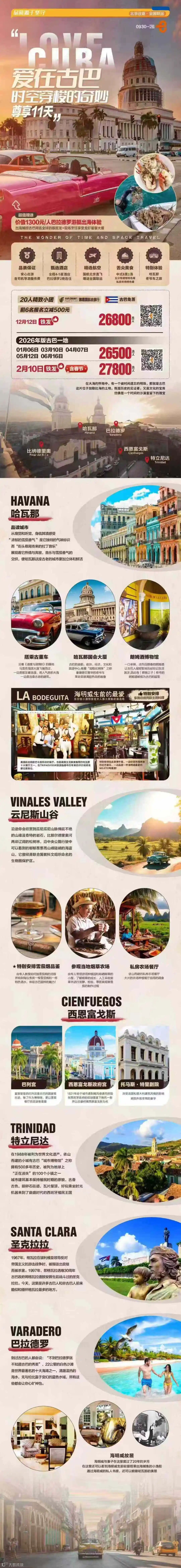 价格:💰149999 元 / 人起,含全程四星酒店,哈瓦那,巴拉德罗,利马,圣地亚哥升级5星 乌鲁班巴,伊基托斯入住特色雨林酒店和庄园酒店