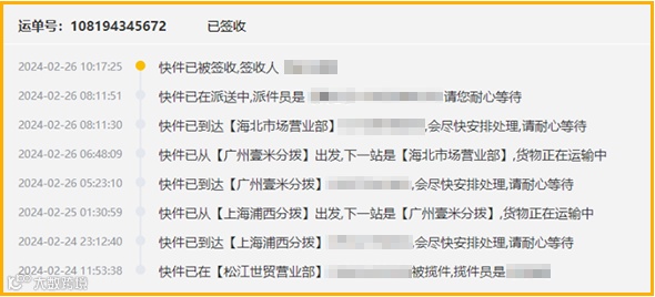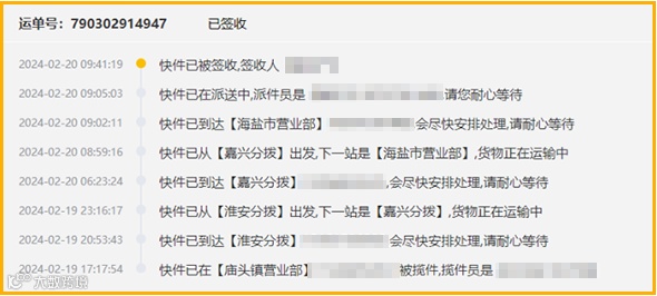 2月19日下午,壹米滴答江苏宿迁庙头镇营业部发出一批货物到嘉兴海盐,次日上午9点41分签收。因为服务好、时效稳定,得到当地客户的高度认可。
