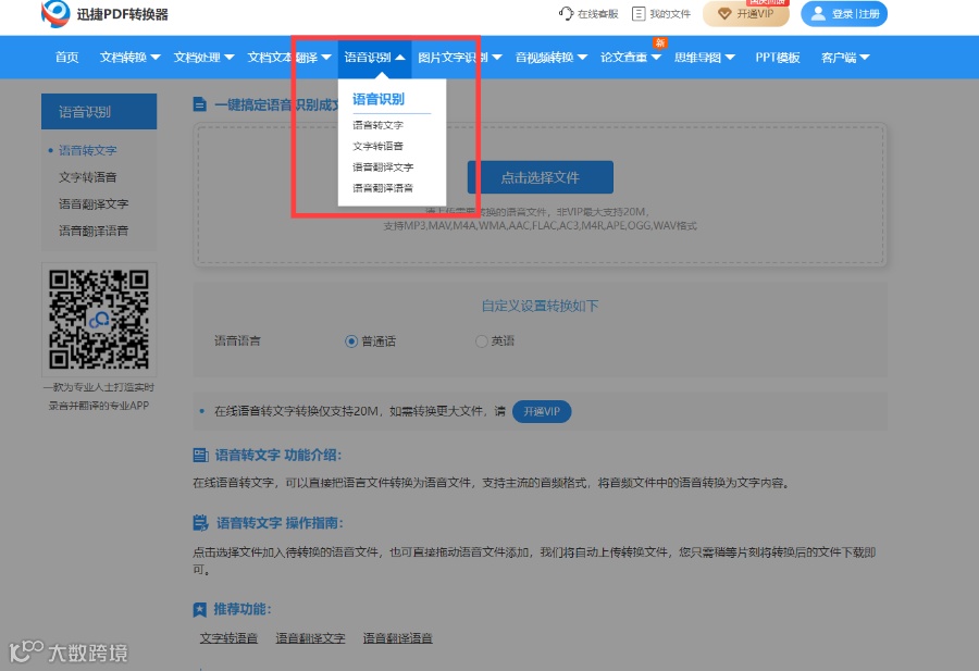 使用方法:主打的功能是PDF转换功能,但是它的语音转文字功能同样是很好用的。在主页面选择语音识别,语音转文字,上传本地音频即可转化。