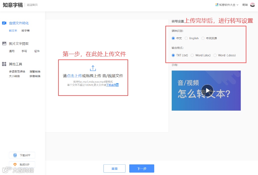 使用方法:登录后点击上传本地视频或音频,转写设置完成后点击“下一步”,在等待转写成功后,可以进行预览和下载。