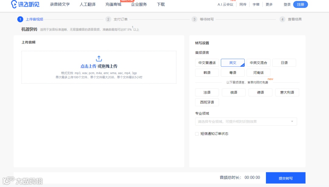 优点:新用户可以免费试用“机器快转”1小时;单个文件支持5小时以内、2G以下的文件,最多可以上传50个文件;支持的格式也比较丰富。
