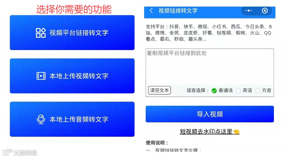 使用方法:复制你想要转文字的视频的链接,打开微信小程序“微转写”,点击视频转文字,把你复制的地址链接粘贴到文本框,点击“导入视频”,在最下方文件处点击查询进度,最后点击一键转写即可完成。