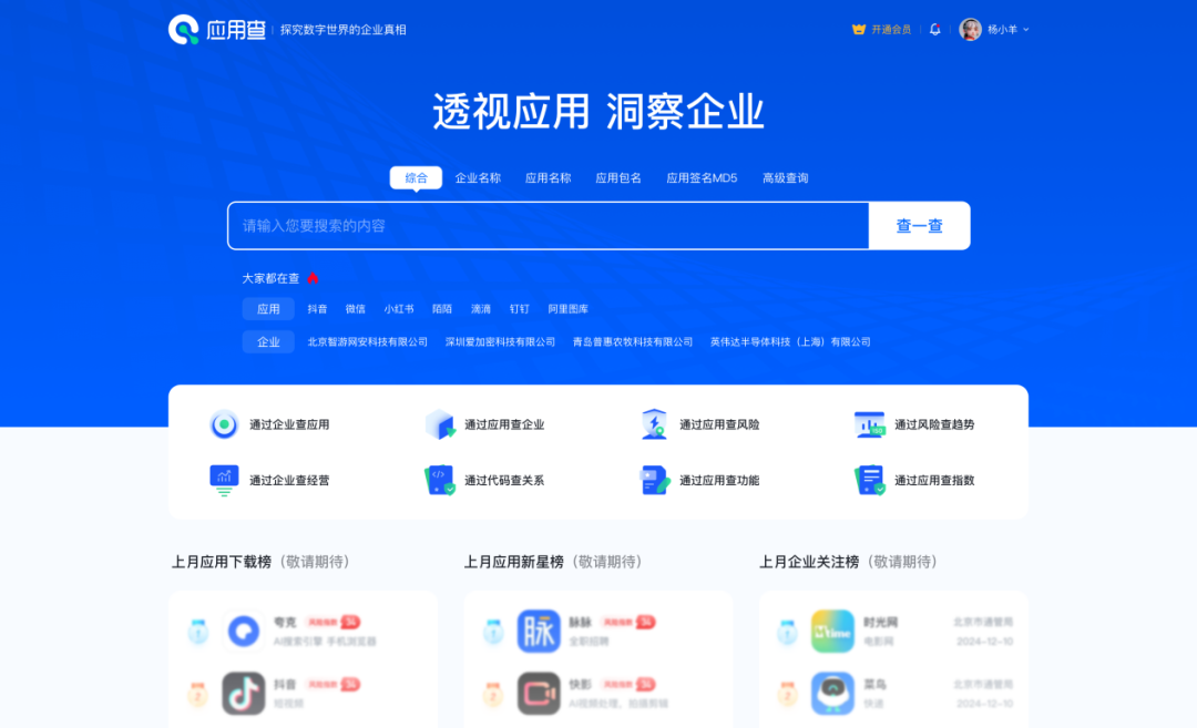 应用查是一款由深圳市国华智算科技有限公司倾力打造,基于国华网安10年来积累的数据丰富的移动应用大数据平台作为核心,专为投资机构、专业人士,以及应用开发与运营团队打造的商业查询平台。通过更深度、更广泛的数据维度,轻松查询企业和应用的关键信息,助力您精准掌握行业趋势、企业实力和市场潜力。在这个数据驱动的时代,应用查不仅帮助您看清企业表面,更挖掘隐藏的价值与潜力。