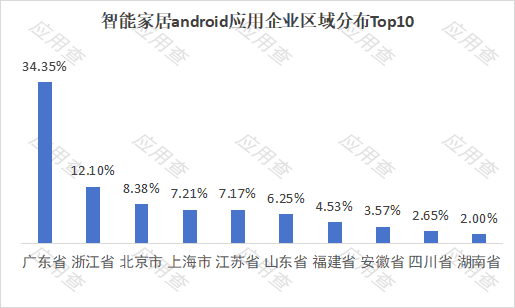 根据应用查统计,智能家居Android应用企业主要以东部、沿海省份经济发达为主,该区域的核心是拥有完善的电子制造业产业链。(如:格力,华为,美的,百度、萤石)。另一方面与顶尖高校和科研机构合作, 北京、上海、江苏、浙江等地拥有中国最顶尖的高校,为产业输送了大量软件工程、人工智能、工业设计等领域的高素质人才。该区域在智能家居行业属于供应链的中上游。