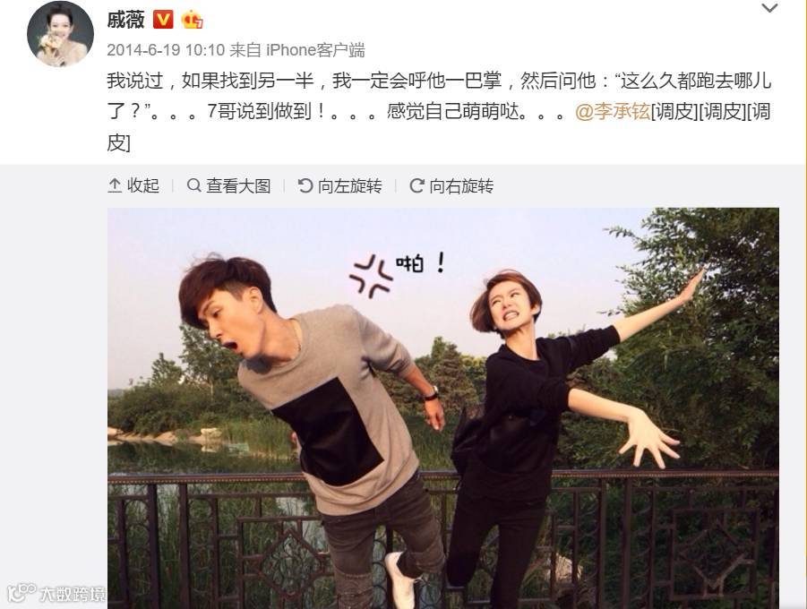 后来由李承铉主动追求戚薇,两人一同在巴西看球的照片被媒体拍到,随即的第二天戚薇便发布鬼马微博,大方公开两人恋情。