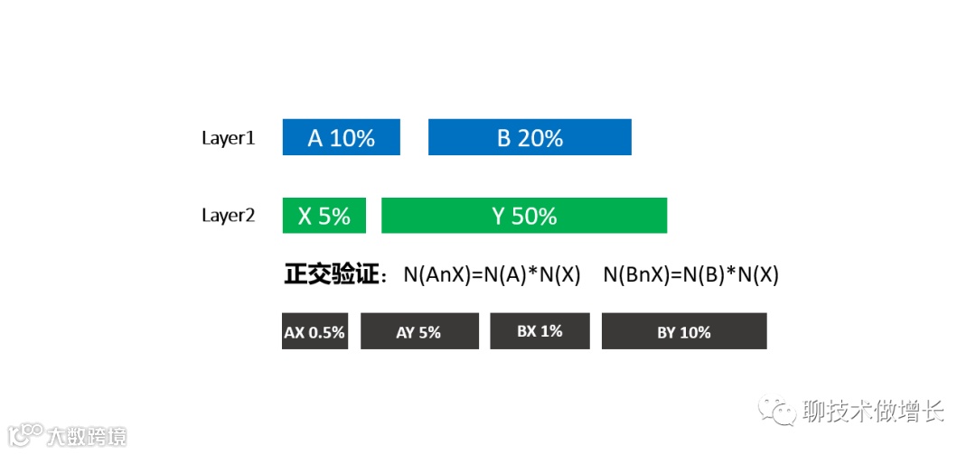 如图6所示,则A,B是第1层中任意两个桶,用户占比例分别为N(A),N(B),X是第2层中任意一个桶,如果满足以下条件:N(AnX)=N(A)*N(X)、N(BnX)=N(B)*N(X),则说明第1层和第2层是正交的。同样,这个也是可以从数学上进行证明的,在此不赘述。