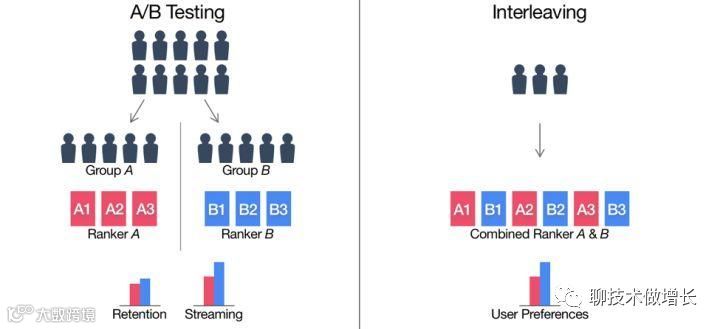 A4:针对这样的情况,Netflix提出了一种interleaving的测试评估方法。如图9所示,interleaving比较适合应用在搜索/推荐/广告的排序场景,这种方法不用将用户事先分为A/B两组,而是将AB两个方案的结果进行随机交替排名,生成一个混合结果,然后对所有的实验用户展示这个混合结果。最后通过统计混合结果中A/B两个方案中各自占比多少从而确定A和B方案的优劣。interleaving方法消除了A/B组测试用户自身属性分布不均的问题,通过给予每个人相同的权重,降低了重度消费者对结果的过多影响。但是这种方法也有自身的缺陷,只能对比出A/B两个方案相对最优,并不能得出具体好多少的度量结论。