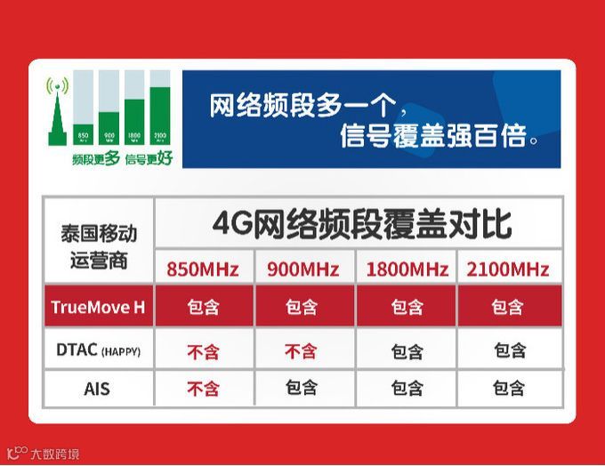 truemove H是泰国唯一拥有4G频段850/900/1800/2100Mhz的运营商,网络覆盖率更高。