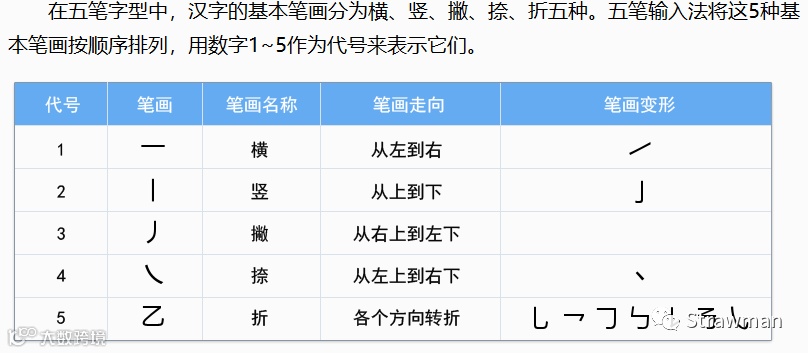 简单点说,类似于用笔画打字,而笔画打字只有“横竖撇捺折”等这样基本的笔画,而五笔打字则先组成了一些比较常用的字根,那么打字的时候可以减少了输入的代码。