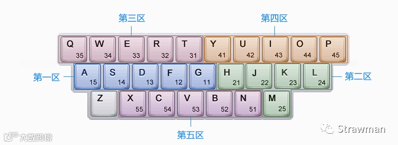 然后将主键盘中除Z外的25键位划分为了“横、竖、撇、捺、折”五个区,分别用代号1~5表示(见图二)
