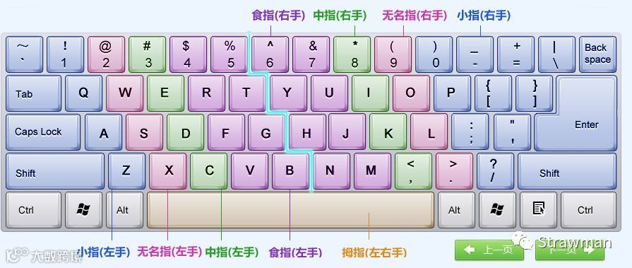 每个手指都有专门负责的区域(见图五),按颜色分类。按照这样的方式我们便可以通过移动最小的距离敲下按键,以提高打字速度。当然了,有些键太远了也不一定要遵循,看个人习惯吧。