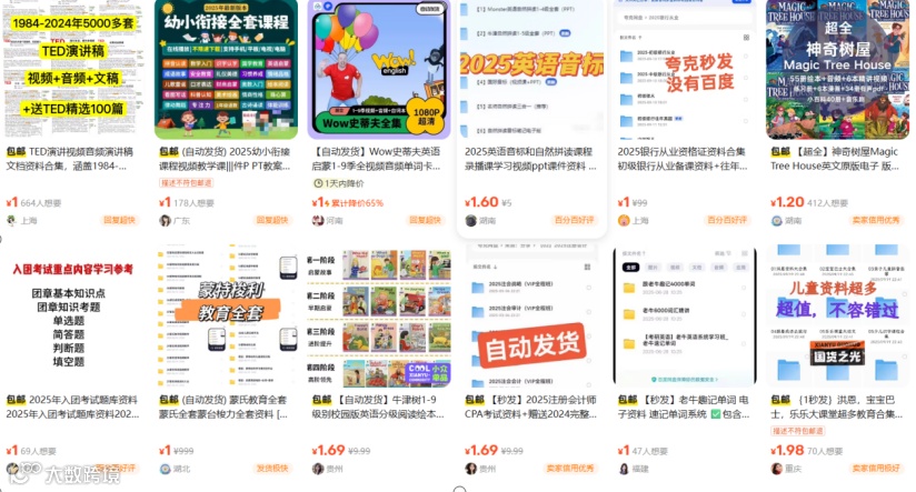 总有人问:“你这资源哪来的?能不能教我?”这时候就可以开课了。比如教别人怎么在闲鱼上卖虚拟资源,收费499元、599元都行。甚至搞“陪跑服务”,手把手带人做账号。一个账号跑通了,再开几个号复制,每个号卖不同类目(比如一个号专攻考试资料,一个号做影视资源),分散风险。