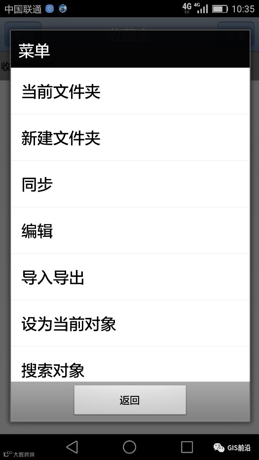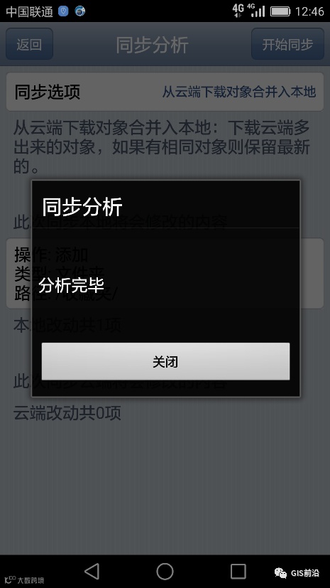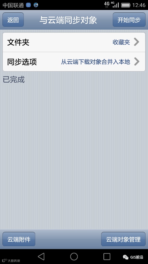 回到奥维互动地图手机APP中点击“收藏”>>>菜单>>>同步>>>同步选项:从云端下载对象合并入本地>>>开始同步>>>分析完成:关闭>>>开始同步>>>已完成。